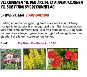 Staudeauksjonen arrangeres av Brøttum bygdekvinnelag på Brøtheim - onsdag 29. mai kl. 19.00.