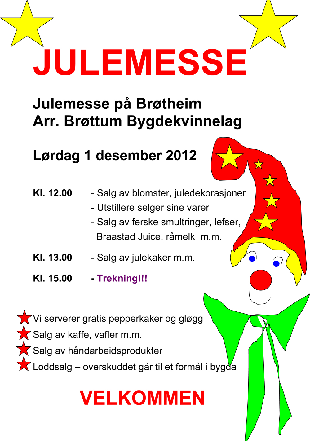Julemesse lørdag 1. desember Publisert 21.11.2012 av asmund Tradisjonen tro blir det julemesse på Brøtheim også i år. Arrangør er Brøttum bygdekvinnelag.