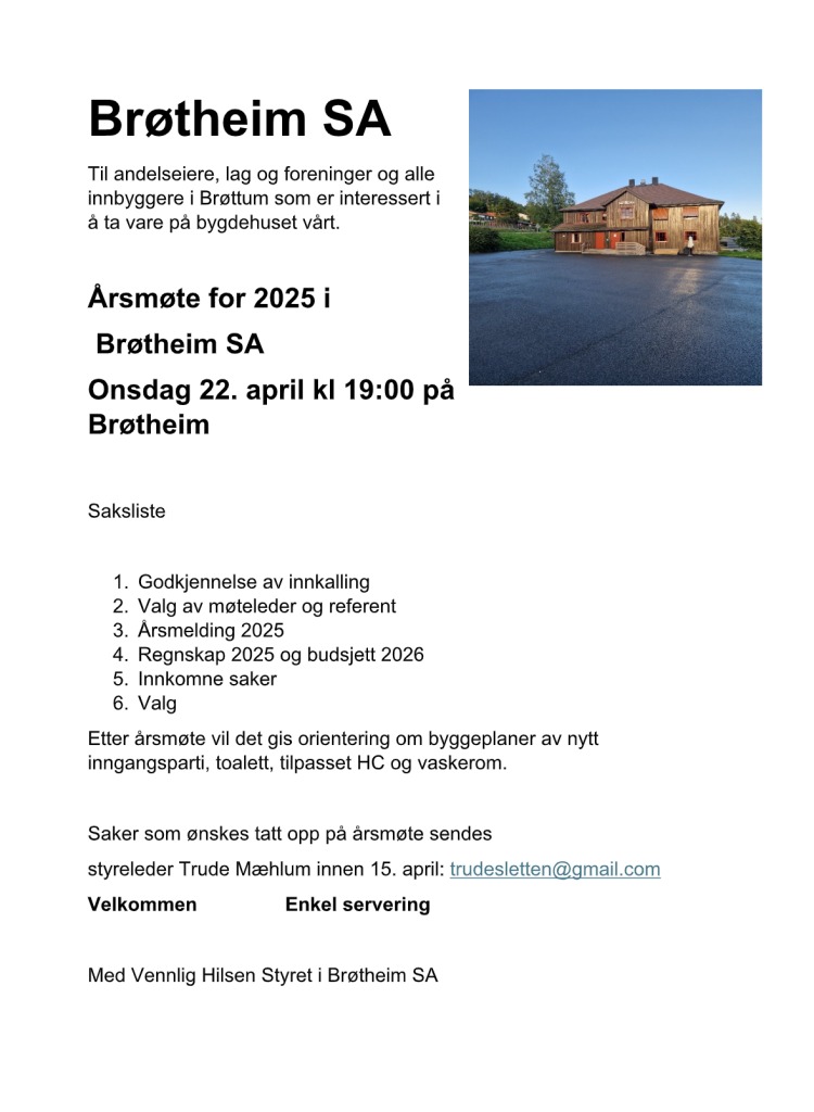 Brøttum Bygdeutvalg inviterer til årsmøte på Brøtheim onsdag 18.03.2026 kl. 19.