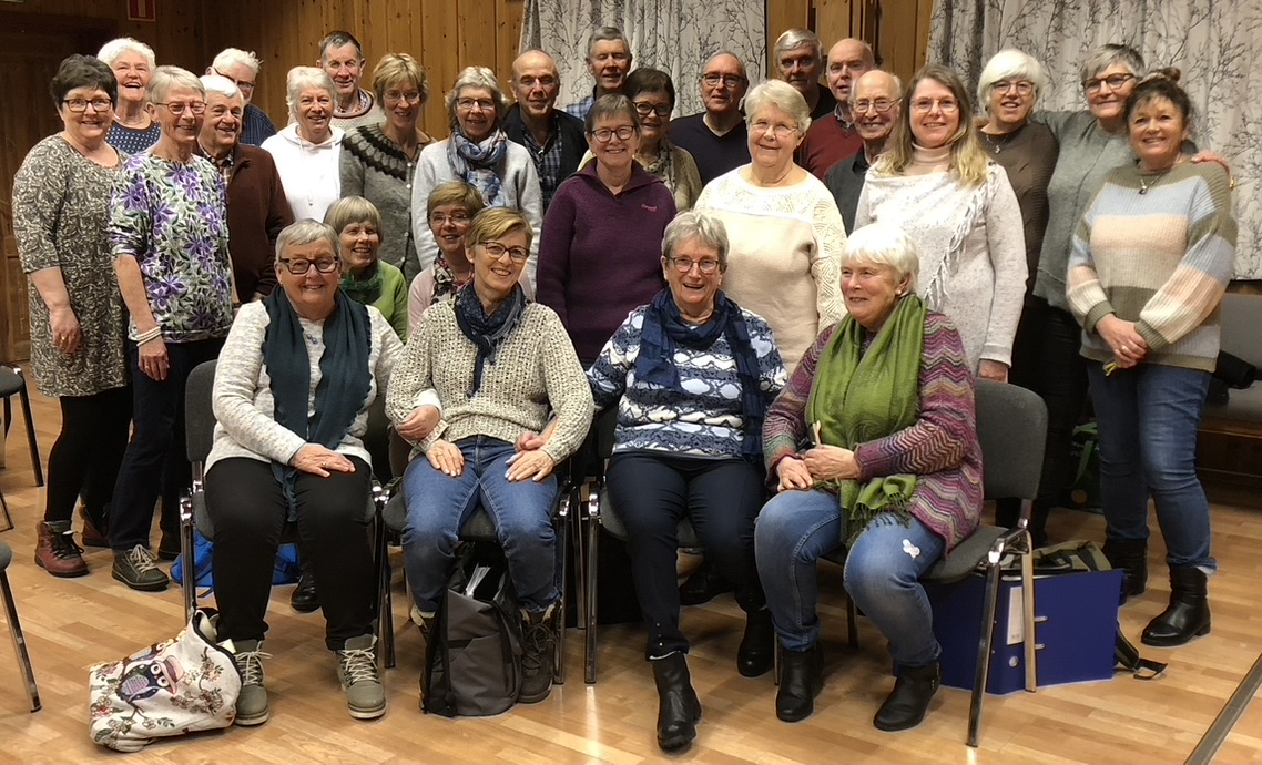 blandet kor med ca. 35 sangere i alderen 50 – 75 år. Stemmefordelingen er god på