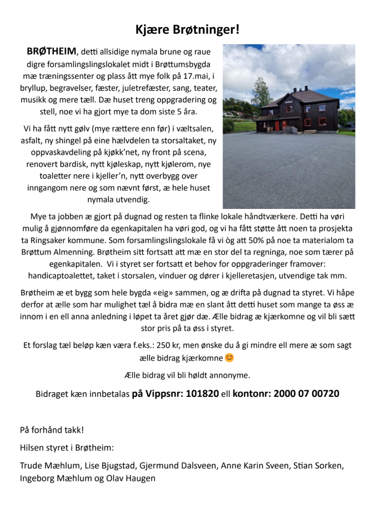 Dette brevet kommer en av de første dagene i din postkasse, alle bidrag til vårt forsamlingslokale Brøtheim er kjærkomne.