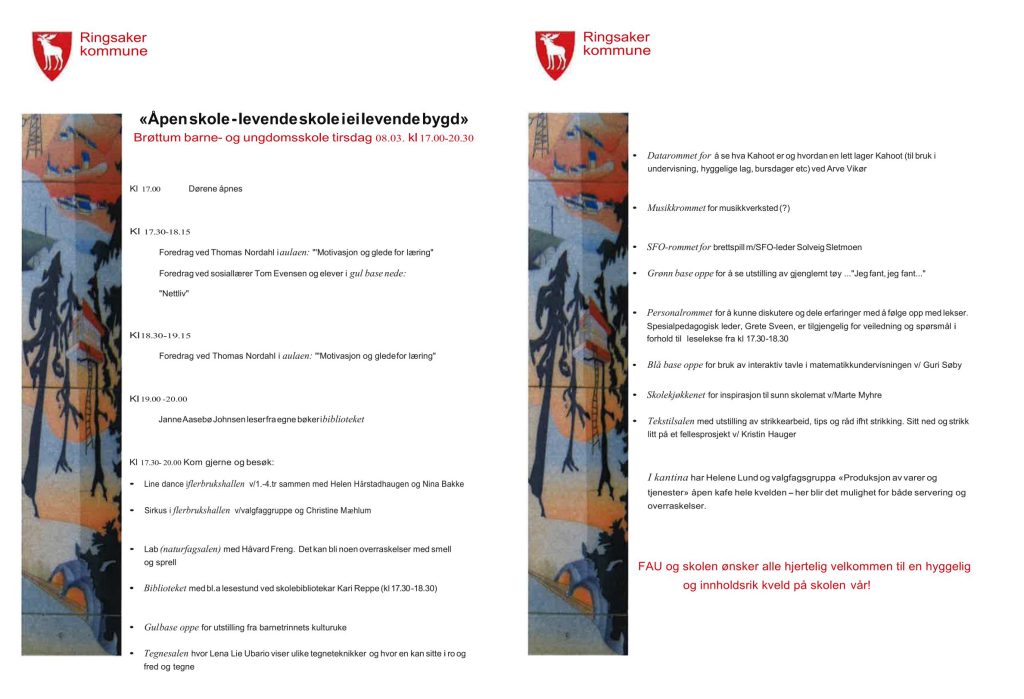 Brøttum barne- og ungdomsskole holder åpent for alle som vil komme tirsdag 8.mars kl 17.00-20.30.